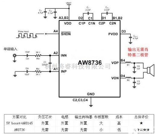 对于该大音量的方案艾为已推出单芯片方案:第六代K类音乐功放AW8736,内置升压电路,为客户节省外围用料和减小布板空间。