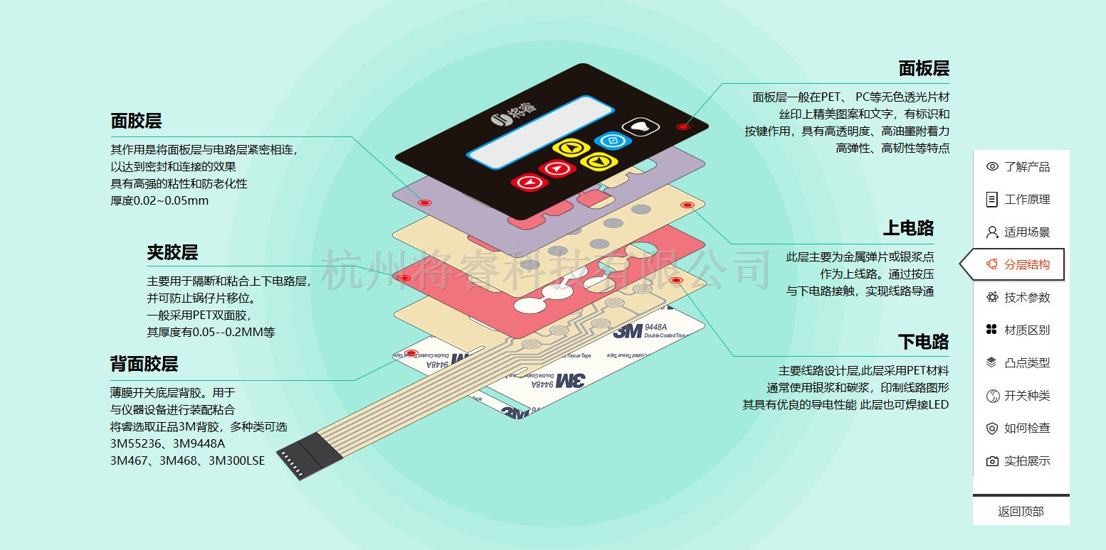 薄膜开关通常由面板层、电路层、隔离层、背胶层等压合而成。通过按压使两层电路触点物理接触,实现电路导通。